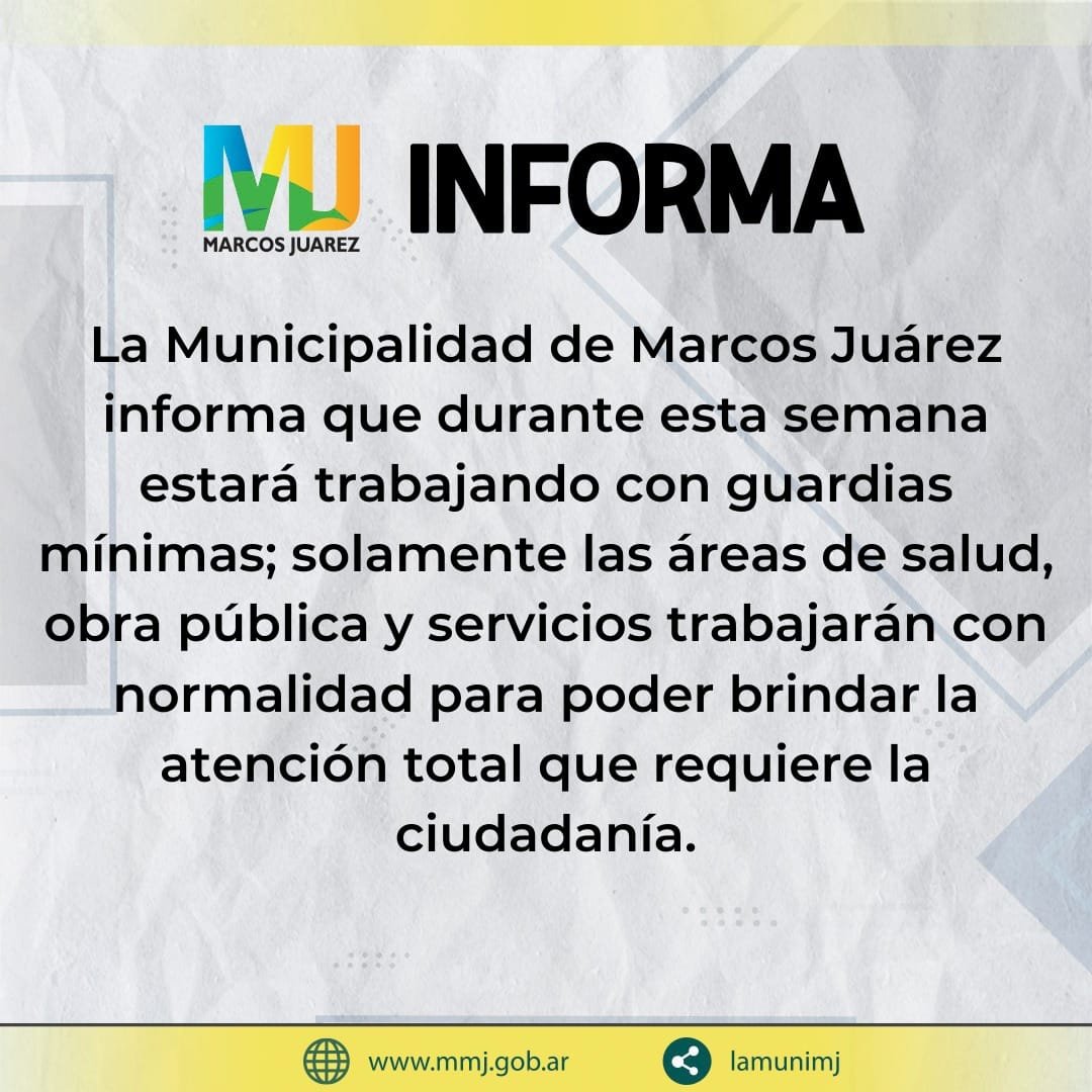 MARCOS JUÁREZ – Tras el fin de semana largo, debido al feriado puente del 24 y al 24 de Mayo, desde el municipio informaron, mediante un comunicado, que trabajarán con guardias mínimas mientras estén vigentes las restricciones decretadas por el Presidente Fernández y a las que adhirió el municipio mediante un Decreto firmado por Dellarossa.