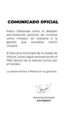 MARCOS JUÁREZ – Tras la confirmación de Pedro Dellarossa de sumarse al gabinete de Martín Llaryora a partir del 10 de diciembre como Ministro de Industria, Comercio y Minería, la intendente municipal, Cra Sara Majorel, difundió un contundente comunicado.