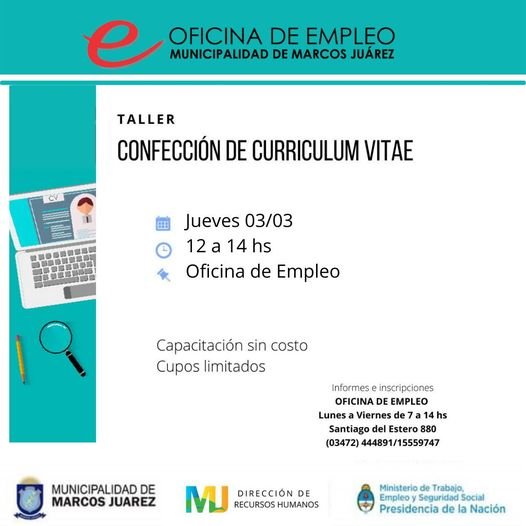 MARCOS JUÁREZ El municipio brindará un taller de confección de Currículum Vitae2022-02-24 jueves 24 de febrero de 2022 En: Locales