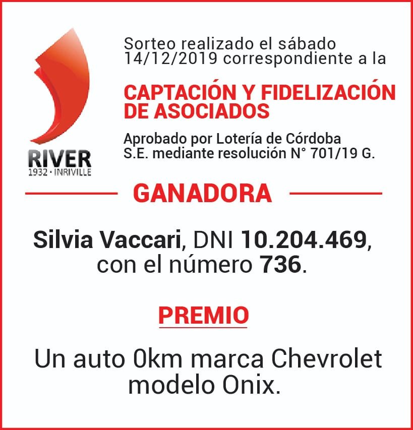 INRIVILLE – El pasado 14 de Diciembre se llevó a cabo el sorteo del Club River de Inriville. En la oportunidad la señora Silvia Vaccari resultó ganadora de un automóvil O KM marca Chevrolet Onix.