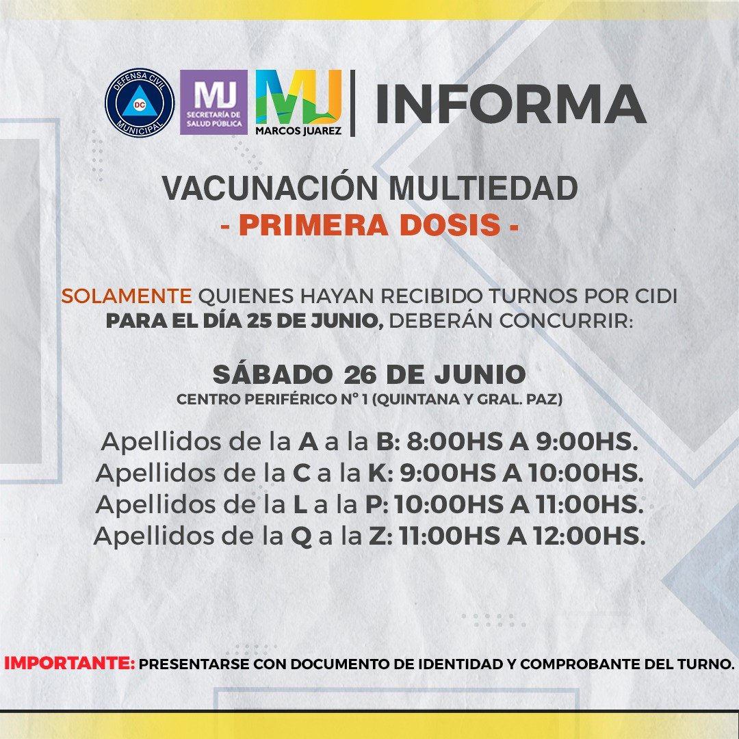 MARCOS JUÁREZ – Desde la Municipalidad de marcos Juárez informaron que el próximo día sábado 26 se llevará a cabo vacunación multiedad en el Centro Periférico Nº1, sito en General Paz y Quintana.