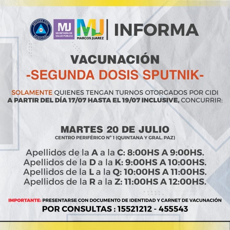 Además, informaron que el martes 20 de Julio se vacunará con segunda dosis de Sputnik V, también en el centro periférico 1.