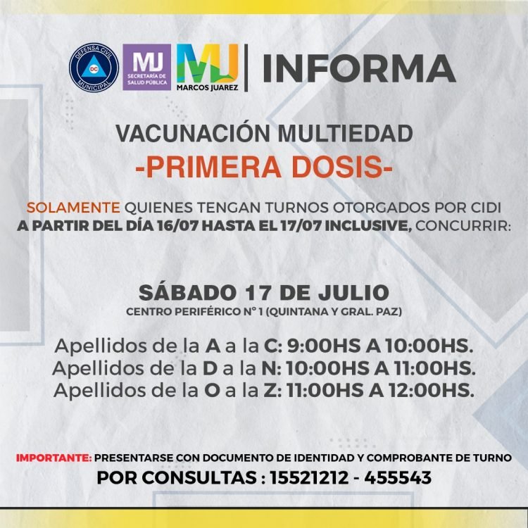 MARCOS JUÁREZ – El municipio difundió el cronograma de vacunación para os próximos días. El mismo indica que el día sábado 17 del corriente se realizará, en el Centro Periférico Nº 1 (Gral. Paz y Quintana) vacunación multiedad con la vacuna china sinopharm.